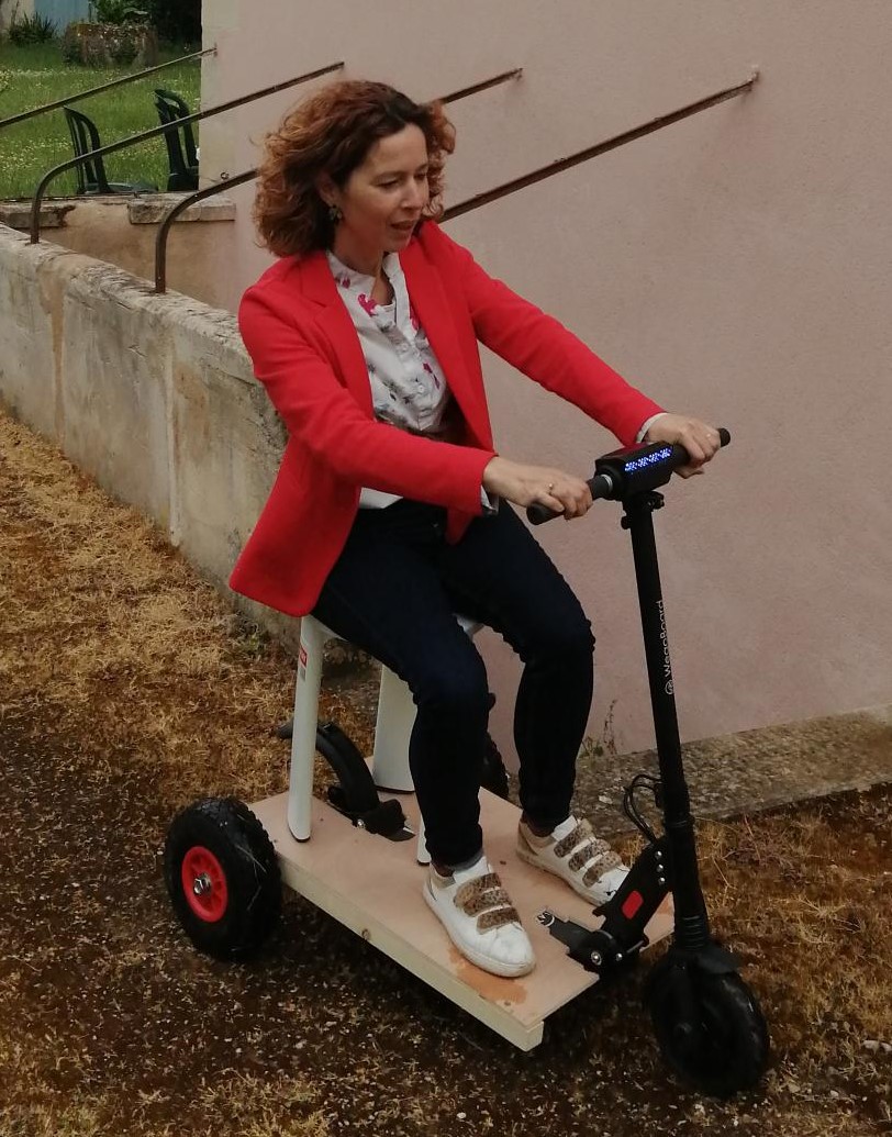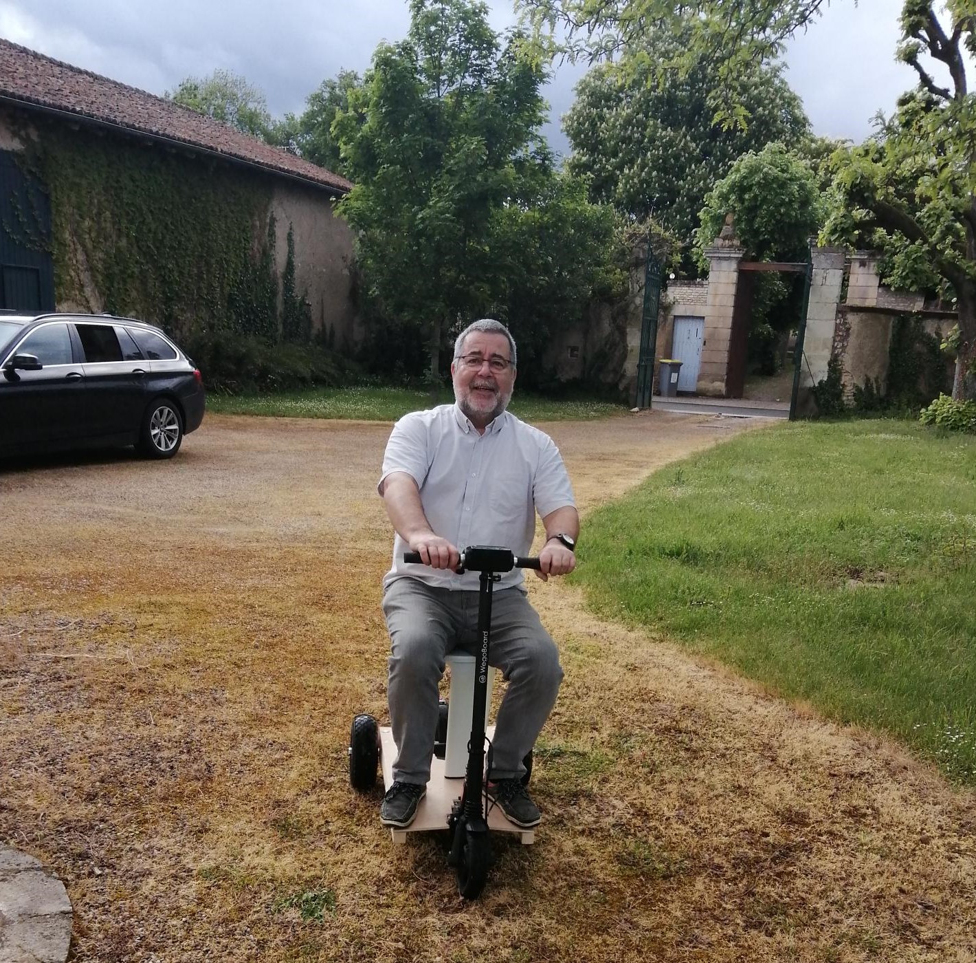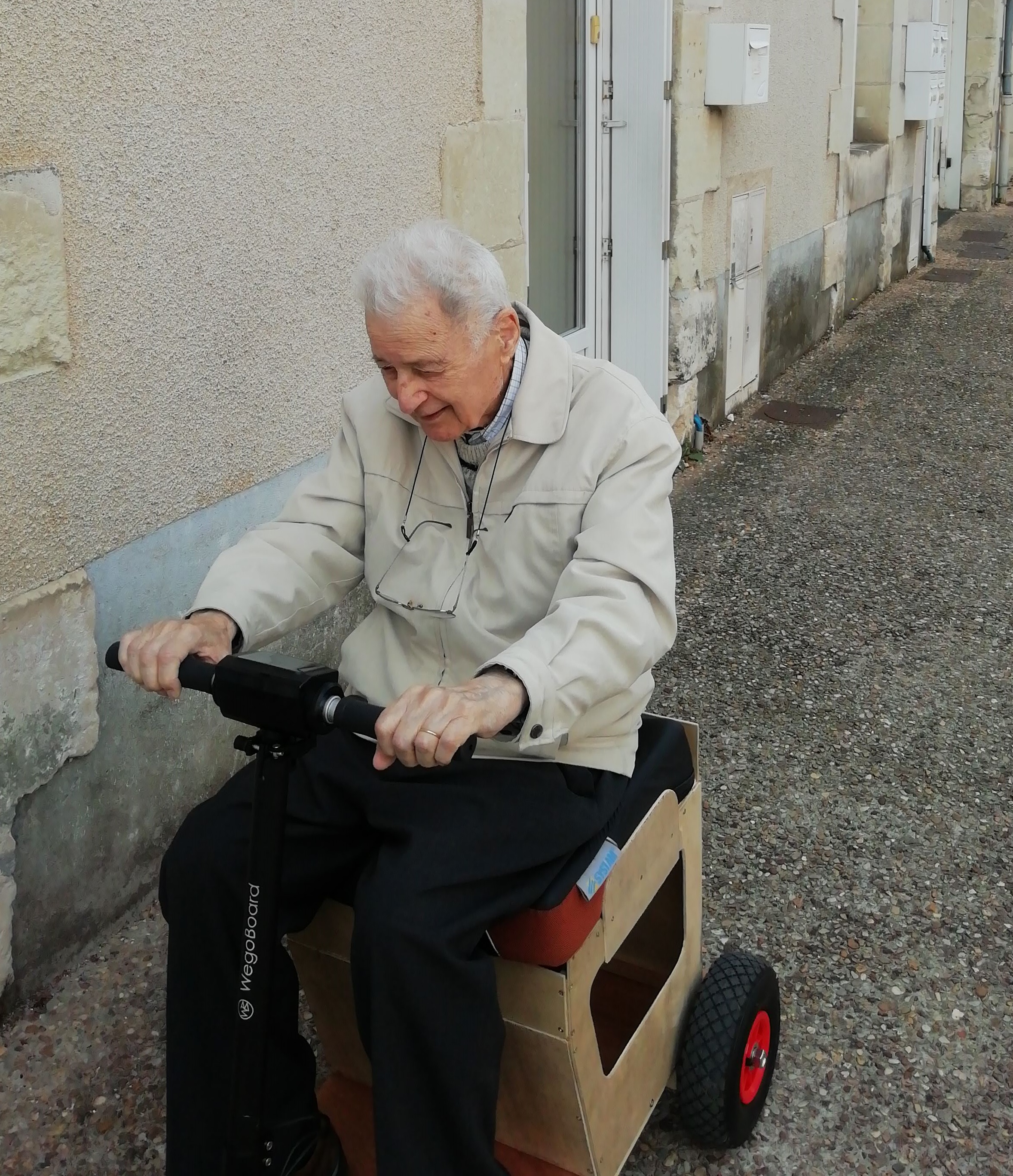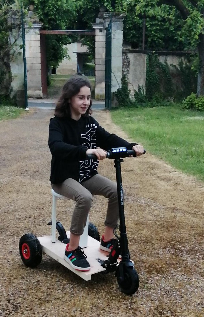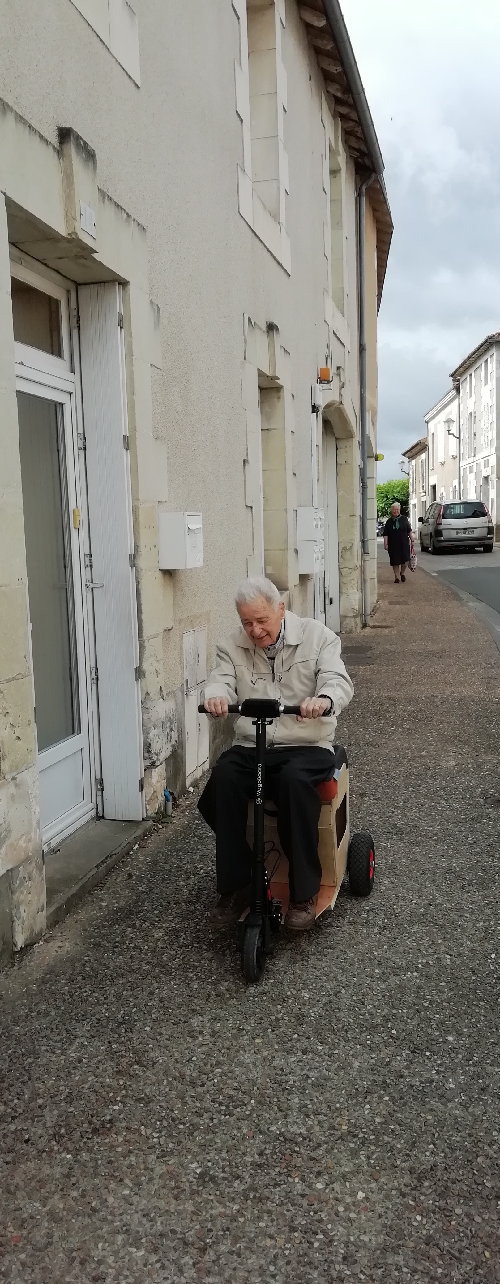 Le prototype en test réel (papa se rend à la messe). On en parle dans Jaunay... Maman a du mal à suivre. Les trois vitesses sont paramétrables (une pour l'intérieur de la maison, très lente, une pour se rendre à l'Eglise ou autre lieu, une de vitesse max, pour circuit uniquement).