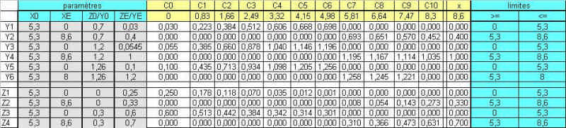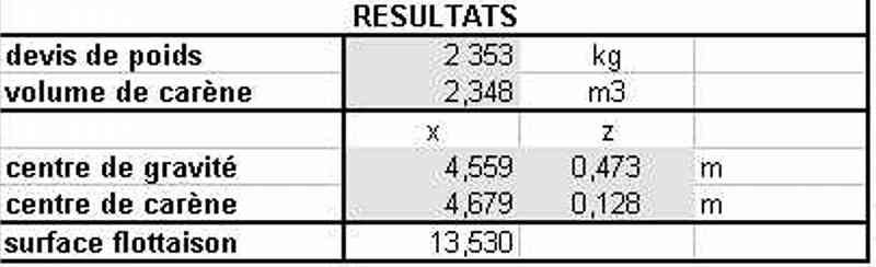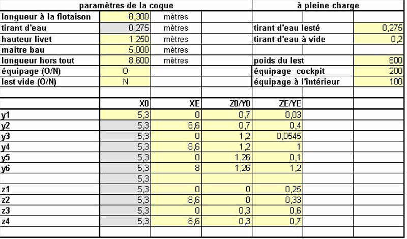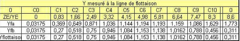 Le tableur calcule tous les points des courbes pour les couples, (même chose pour les cloisons), le centre de carène, le volume immergé de la carène, le centre de gravité du bateau ...