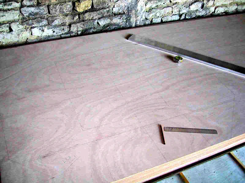 Tracé des couples sur le contre-plaqué : les encoches des lisses et serres sont tracées, ainsi que les emplacemennts de renforts et tasseaux, les cloisons ou panneaux orthogonaux...