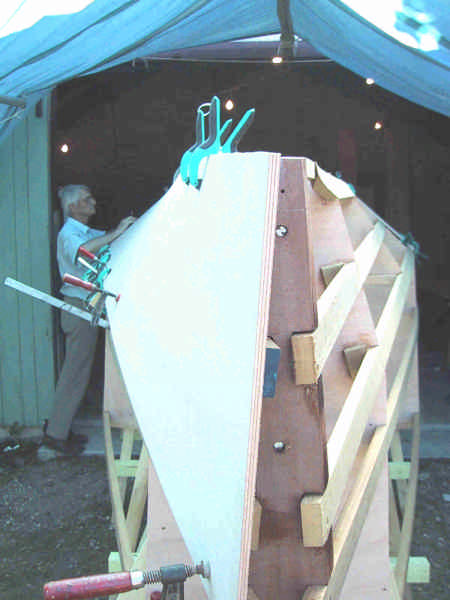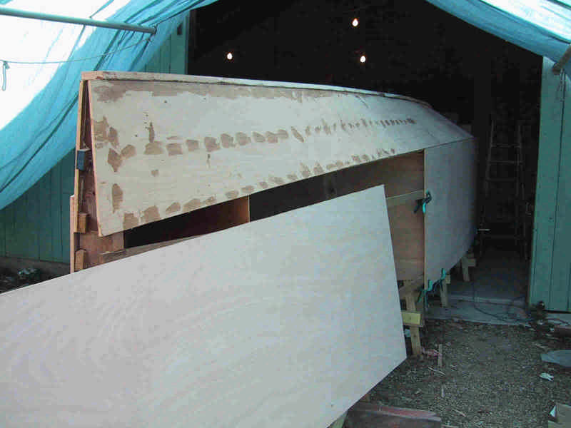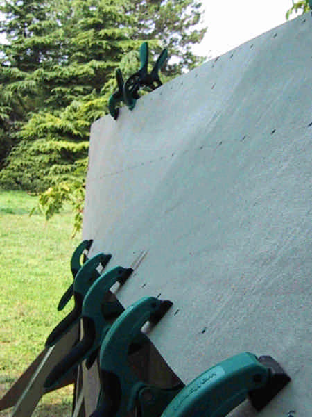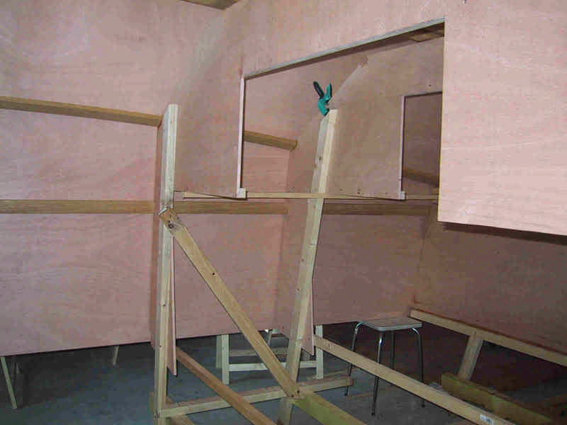 Les panneaux de contreplaqué sont fixés sur la structure pour être dessinés avant découpe. |