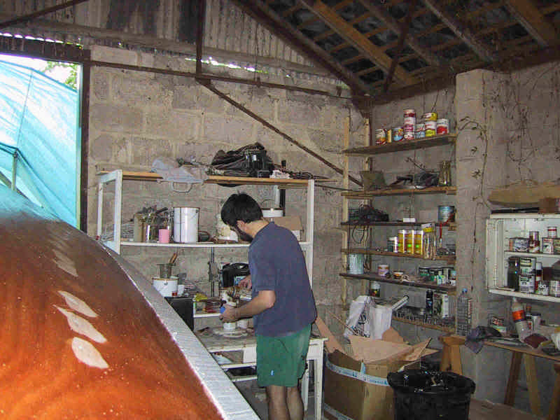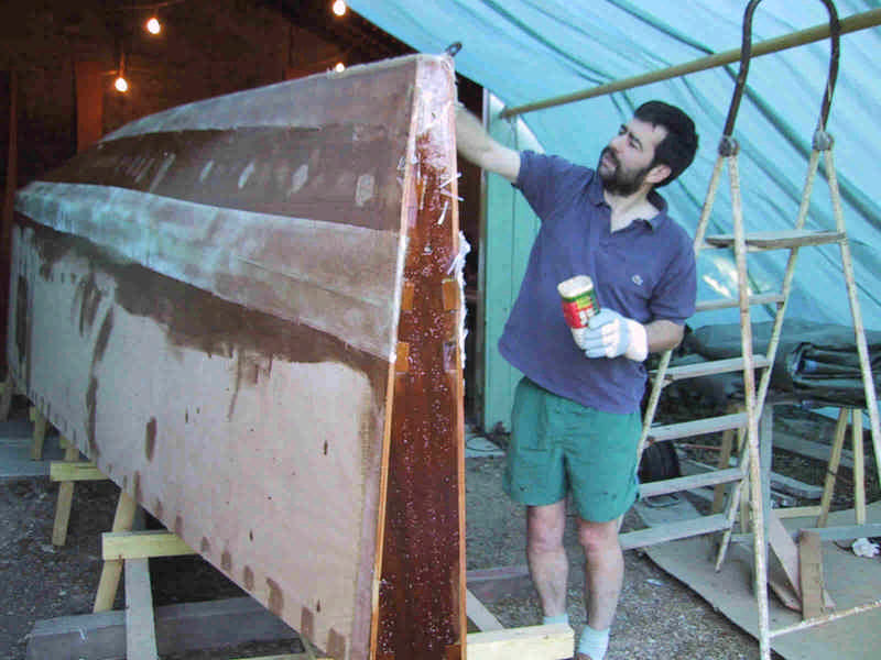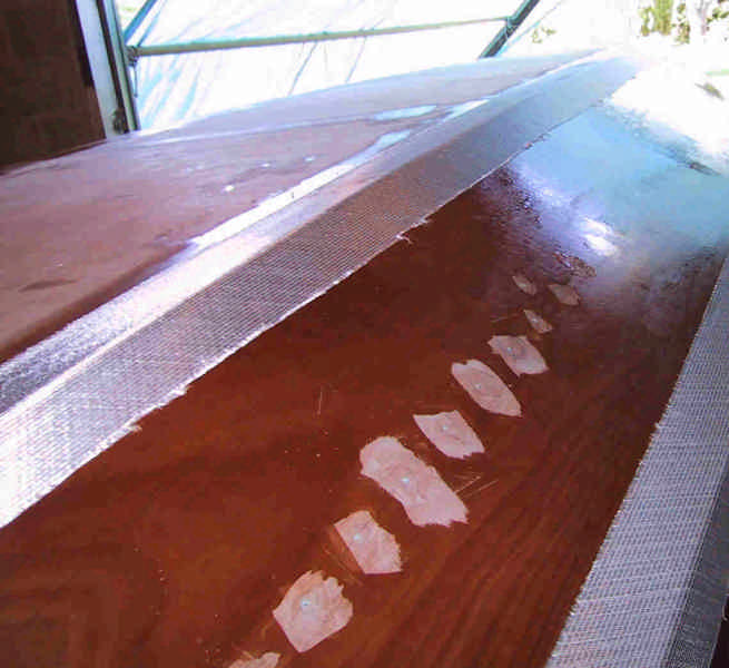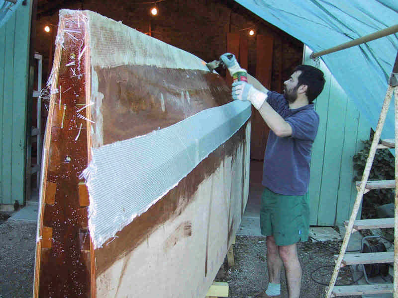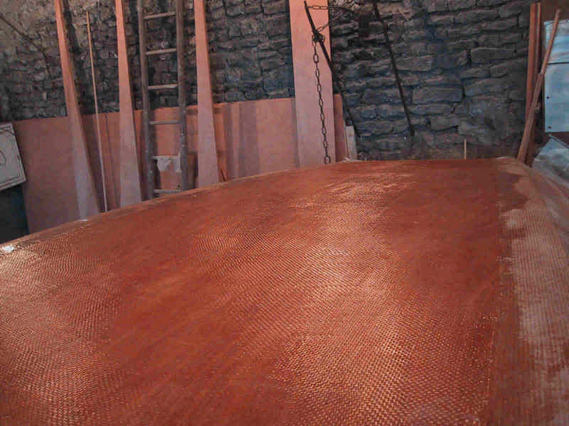 Pose d'un ruban de tissu de verre sur les bouchains et d'un tapis de tissus sur le fond.