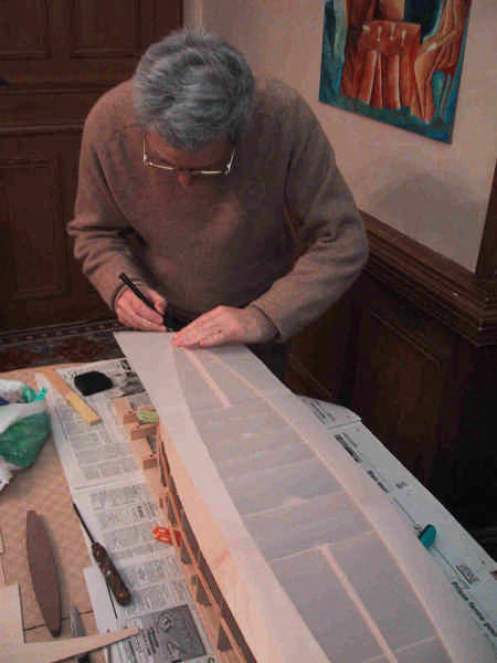 Tracé du bordé de fond. Ce relevé servira plus tard à identifier les découpes optimales des panneaux de contreplaqué.