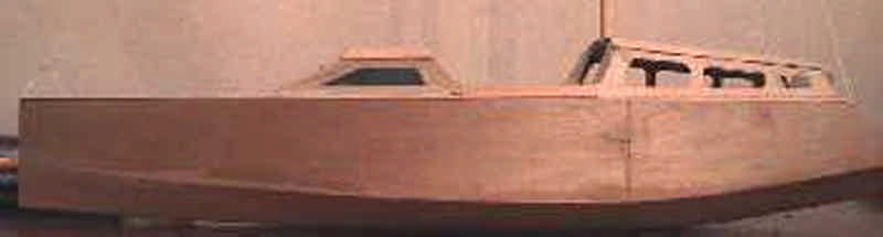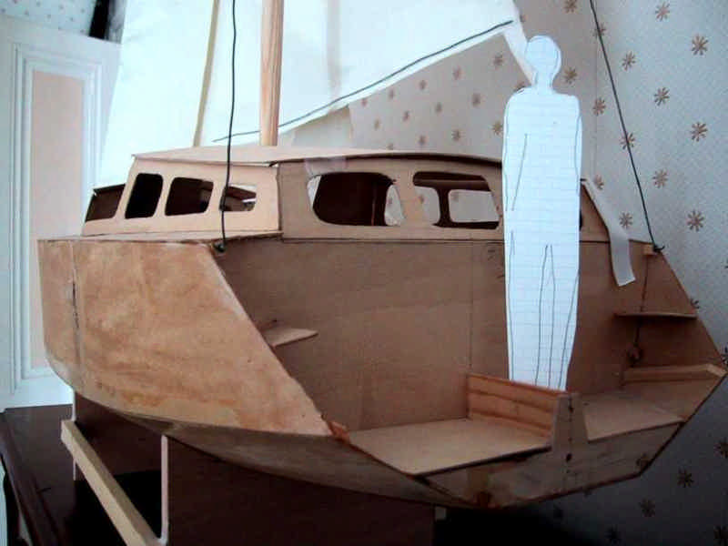 On distingue sur la maquette le projet d'emplantement du mât, très en arrière. Le plan initial prévoyait un mât classique sur l'avant. Ici, il y a deux focs en tandem, 22 m2 et 16 m2, et pas de grand voile.