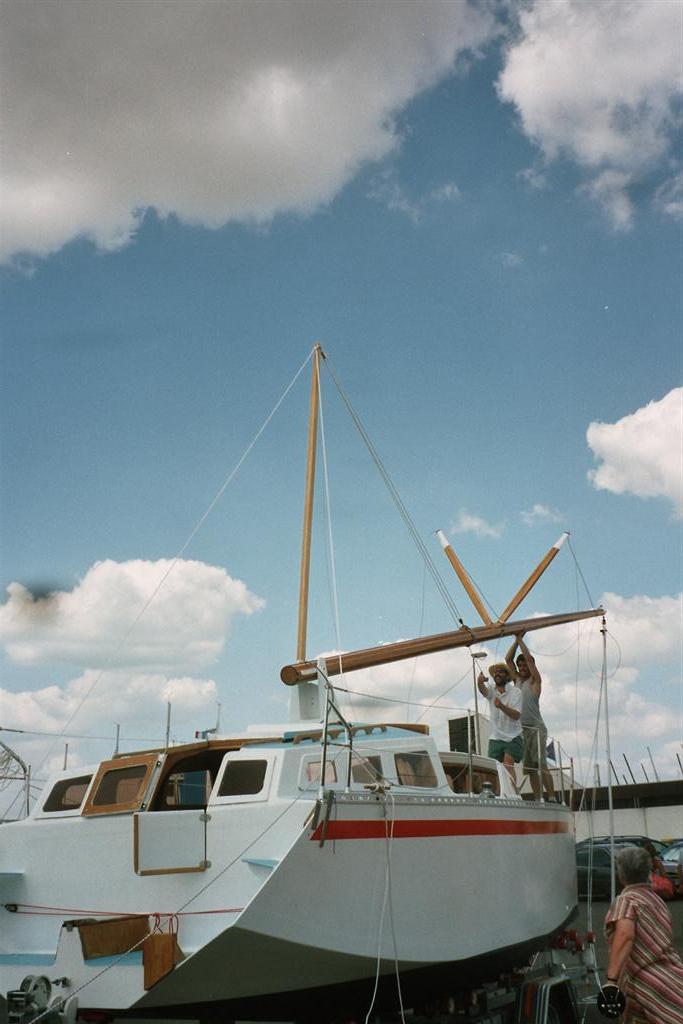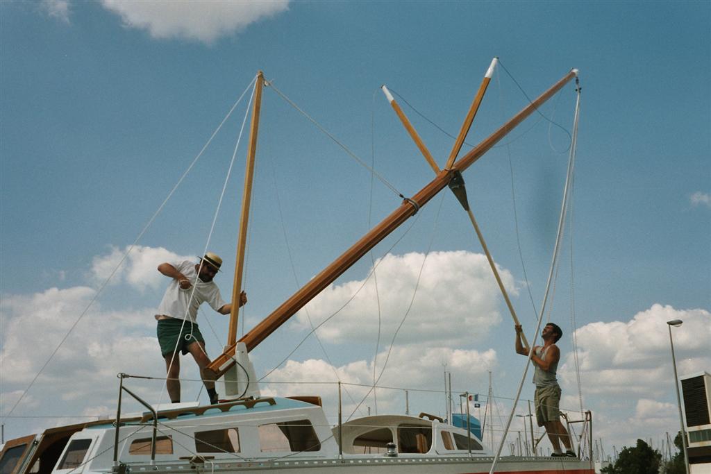 Nous pouvons hisser le mât à deux. Mais c'est lourd (80 kg).