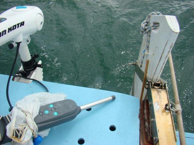 Le premier moteur était un Minn Kota, 36 Volts, très silencieux, mais pas assez puissant pour la Bretagne Nord. Le second est un Torqeedo de 4000 W avec un parc de 4 batteries (48V- 110 AH) à capacité de décharge profonde.