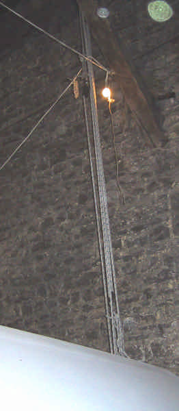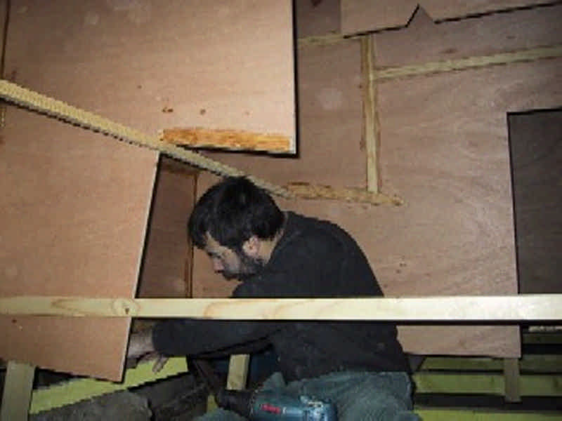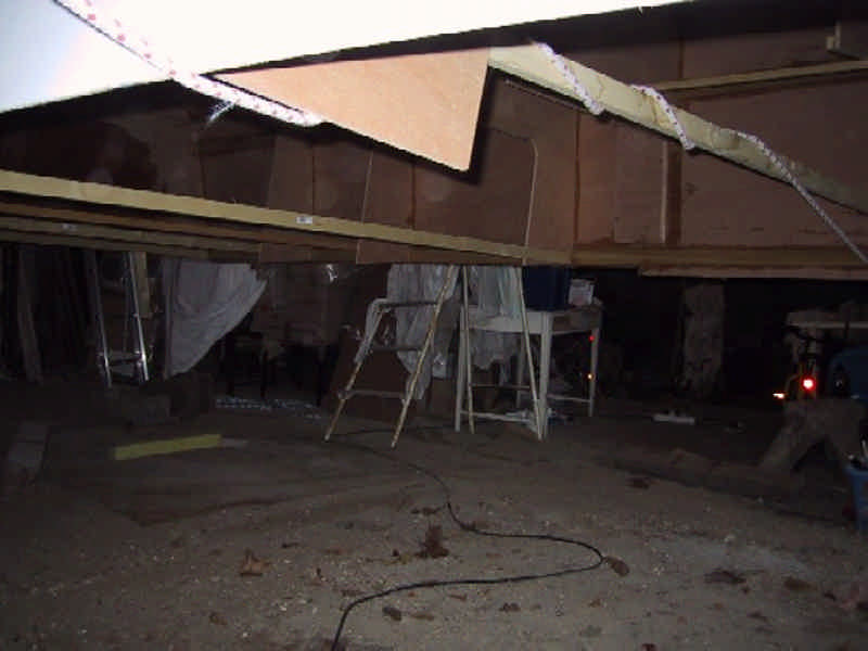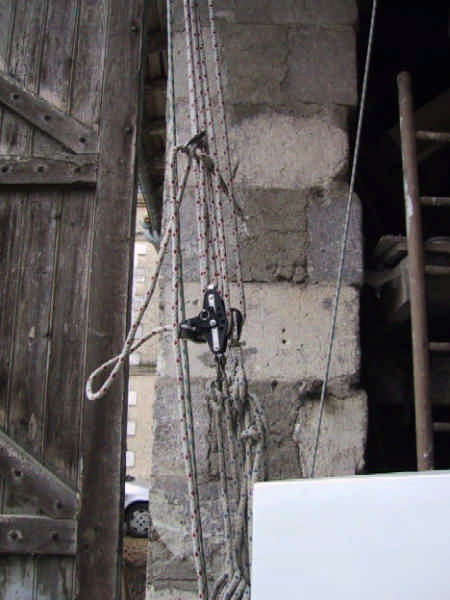 mise en place de palans qui prennent sur les poutres et démontage des "jambes" qui ont servi à maintenir en position les cloisons.
