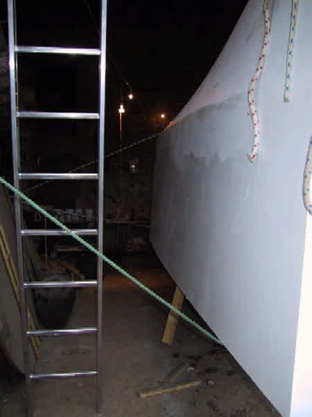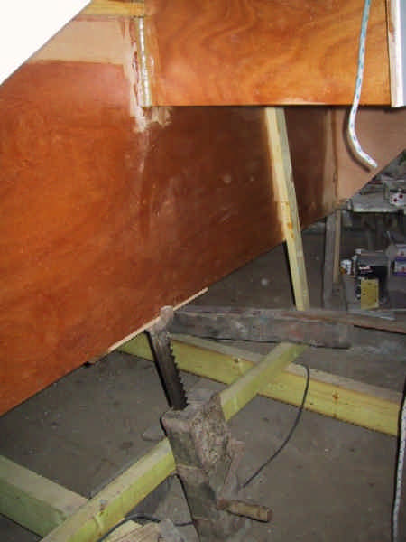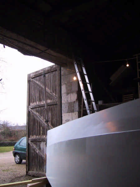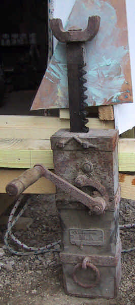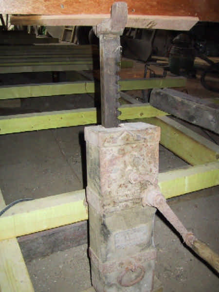 Utilisation d'un cric agricole (machine à battre) pour le tableau et l'étrave et faciliter le levage. Il faut amener l'axe de rotation à 1,60 mètre au dessus du sol.