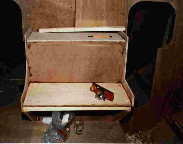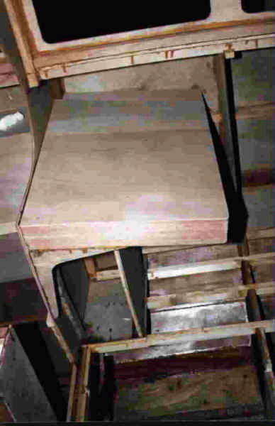 ![]() Deux volées de marches - on aperçoit à droite l'entrée des toilettes, et à gauche, celle de la couchette double arrière. |