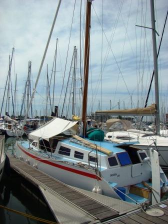 Notre bateau s' appelle DOUZIL un bon bateau il a le mas marrons le pont et le toit bleu le cockpit blanc. |