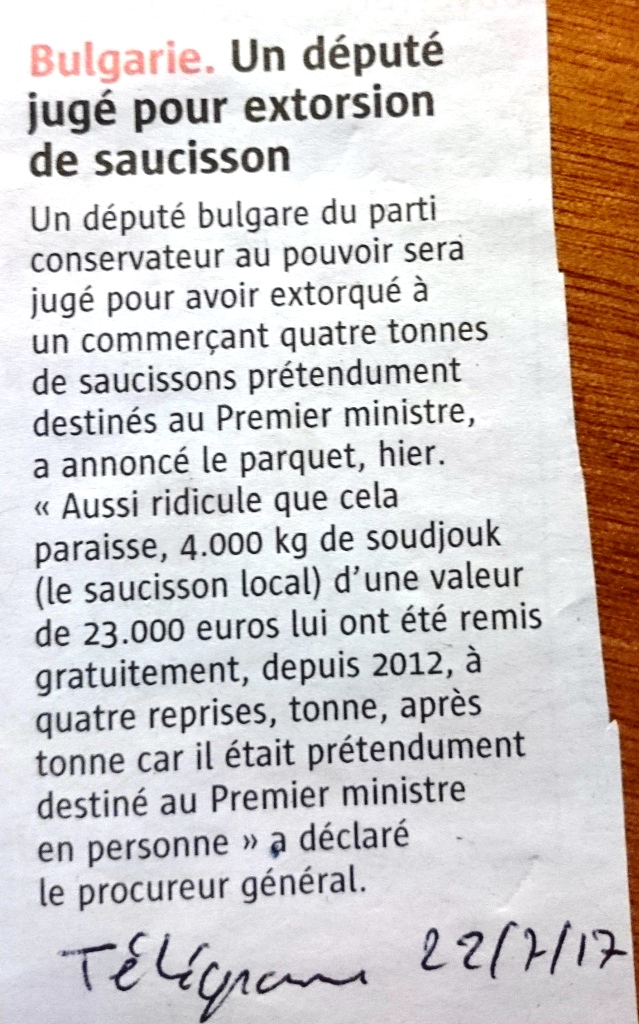 Le Télégramme, 22 juillet : un député bulgare est jugé pour extorsion de saucisson. Ouest France du 24 juillet : une femme assassine son mari et est confondue... par son perroquet.